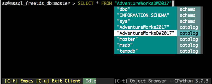 This project would not be possible without the most excellent python prompt toolkit library. In addition, idea and code sharing between the clients that leverage this library is rampant, and this project is no exception - a big thanks to all the dbcli contributors.