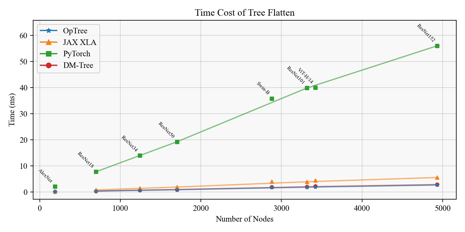 optree.tree_flatten(...) will flatten the tree and return a list of leaf nodes while the non-leaf nodes will store in the tree specification.
