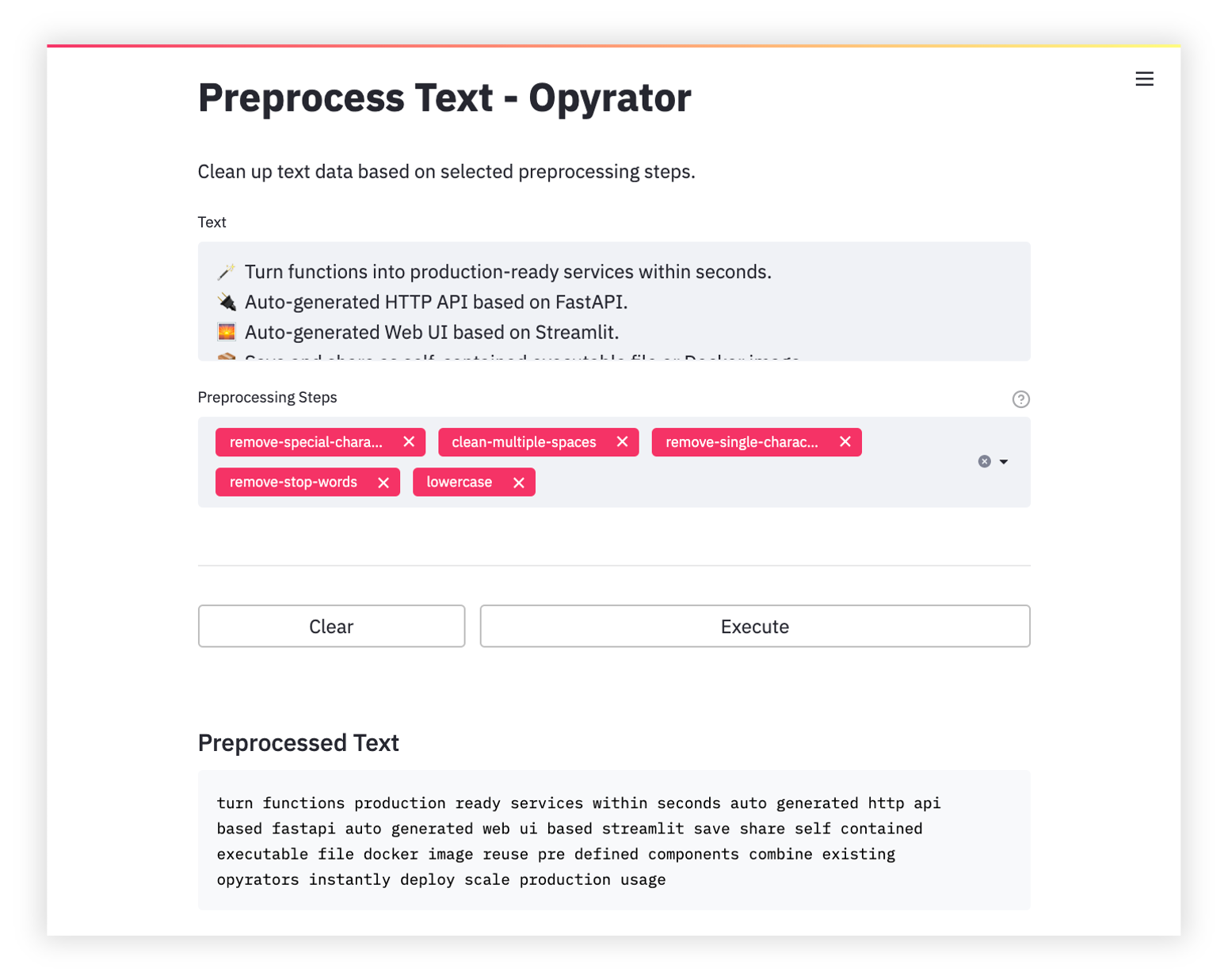 opyrator launch-ui app:preprocess_text --port 8051