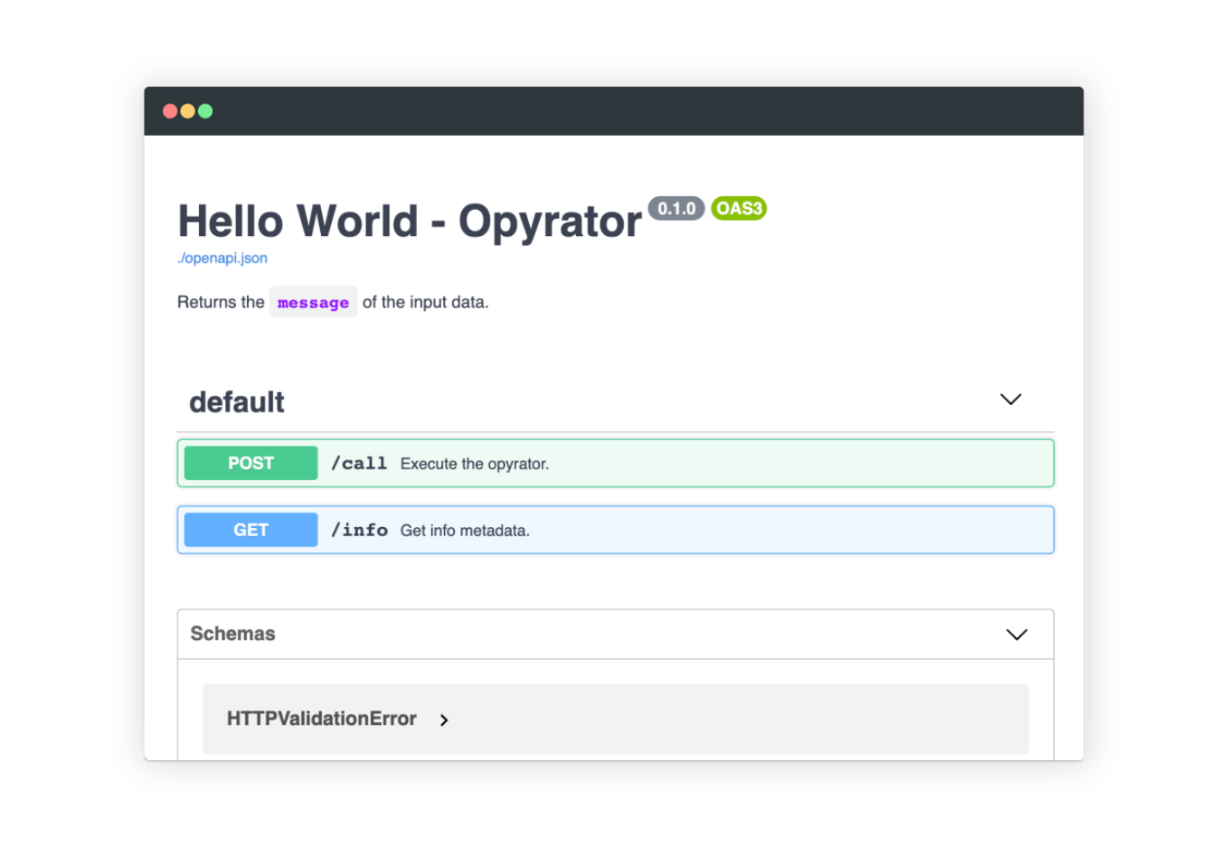 opyrator call http://my-opyrator:8080 '{"message": "hello"}'