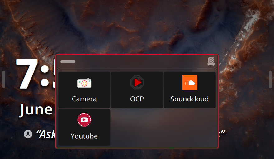 OpenVoiceOS comes with support for dedicated voice applications. Voice Applications can be dedicated skills or PHAL plugins, providing their own dedicated user interface. The application launcher will show you a list of all available voice applications. You can access the application launcher by tapping on the center pill button on the bottom of the home screen.