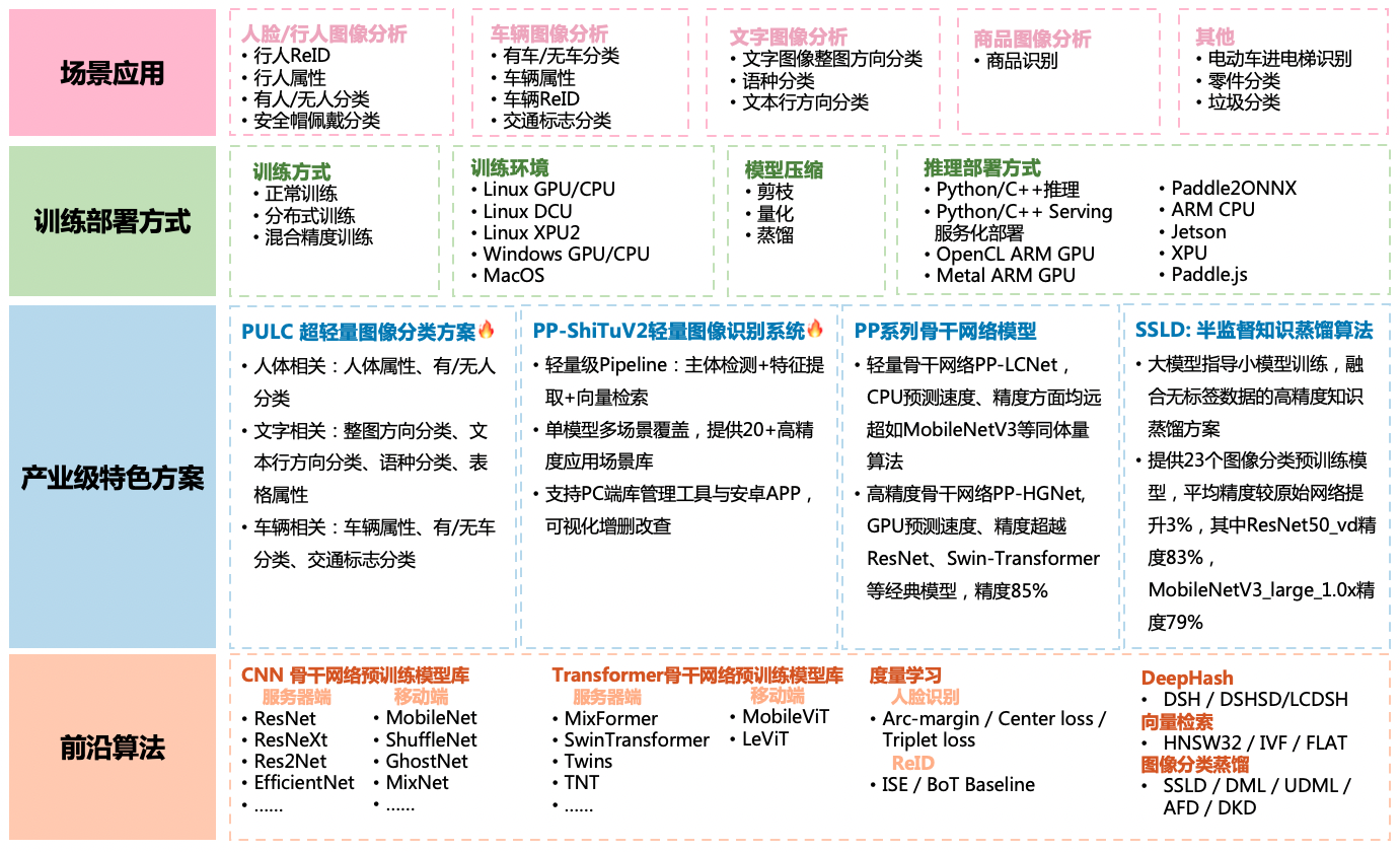 | PULC 超轻量图像分类方案 | 固定图像类别分类方案 | 人体、车辆、文字相关9大模型:模型库连接 |