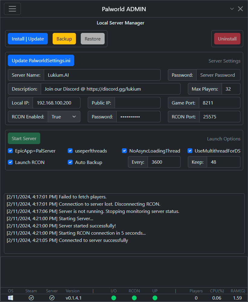 - Click Start Server, take note of the Local IP / RCON port / Admin Pass