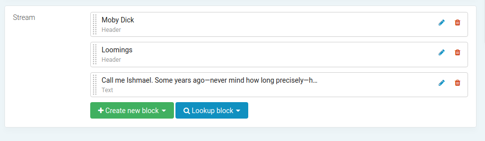 StreamBlockModelAdminclass.# blocks/admin.py from django.contrib import admin from streamfield.admin import StreamBlockModelAdmin from .models import HeadingBlock, TextBlock @admin.register(HeadingBlock) class HeadingBlockAdmin(StreamBlockModelAdmin): list_display = ["__str__", "rank"] @admin.register(TextBlock) class TextBlockAdmin(StreamBlockModelAdmin): pass