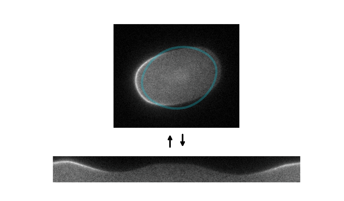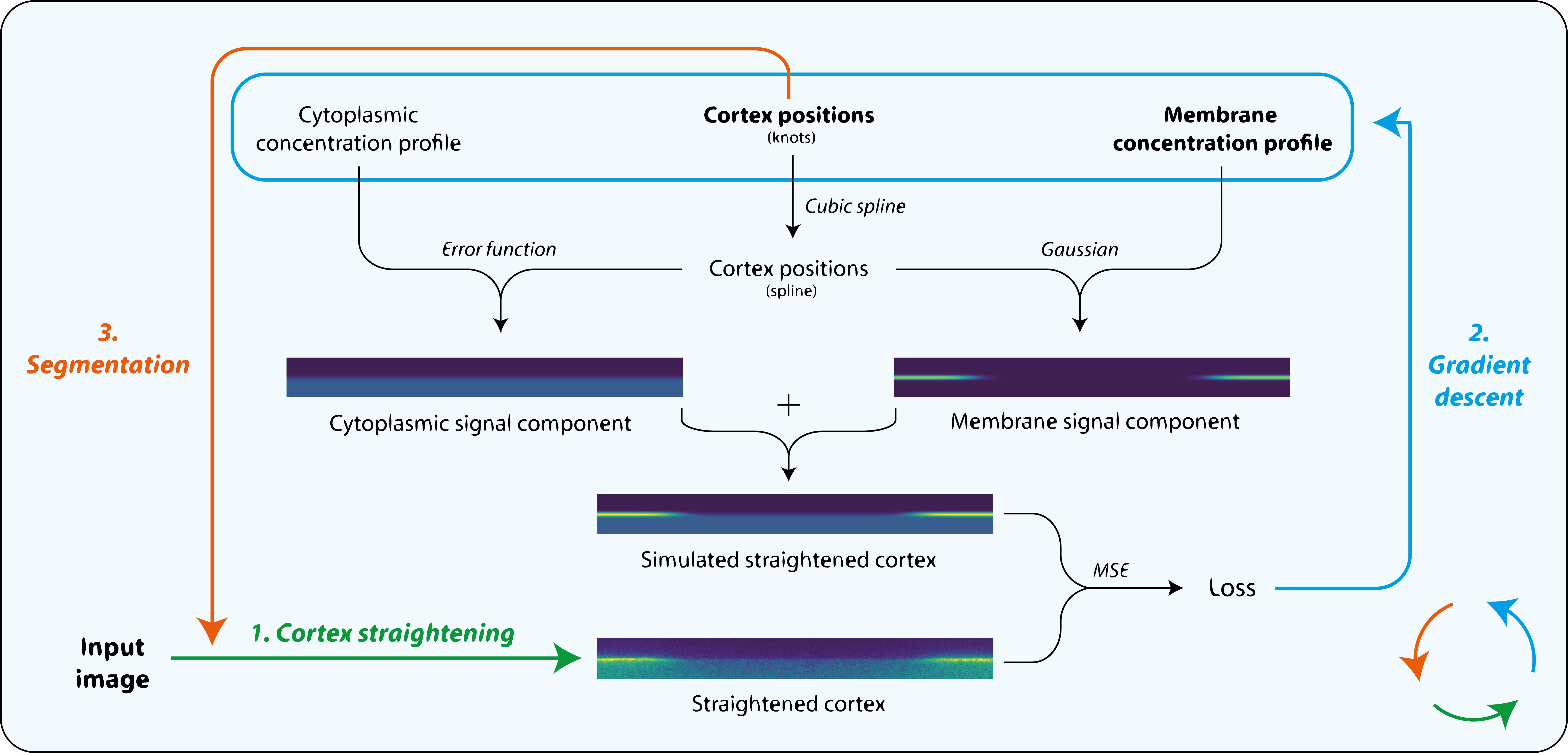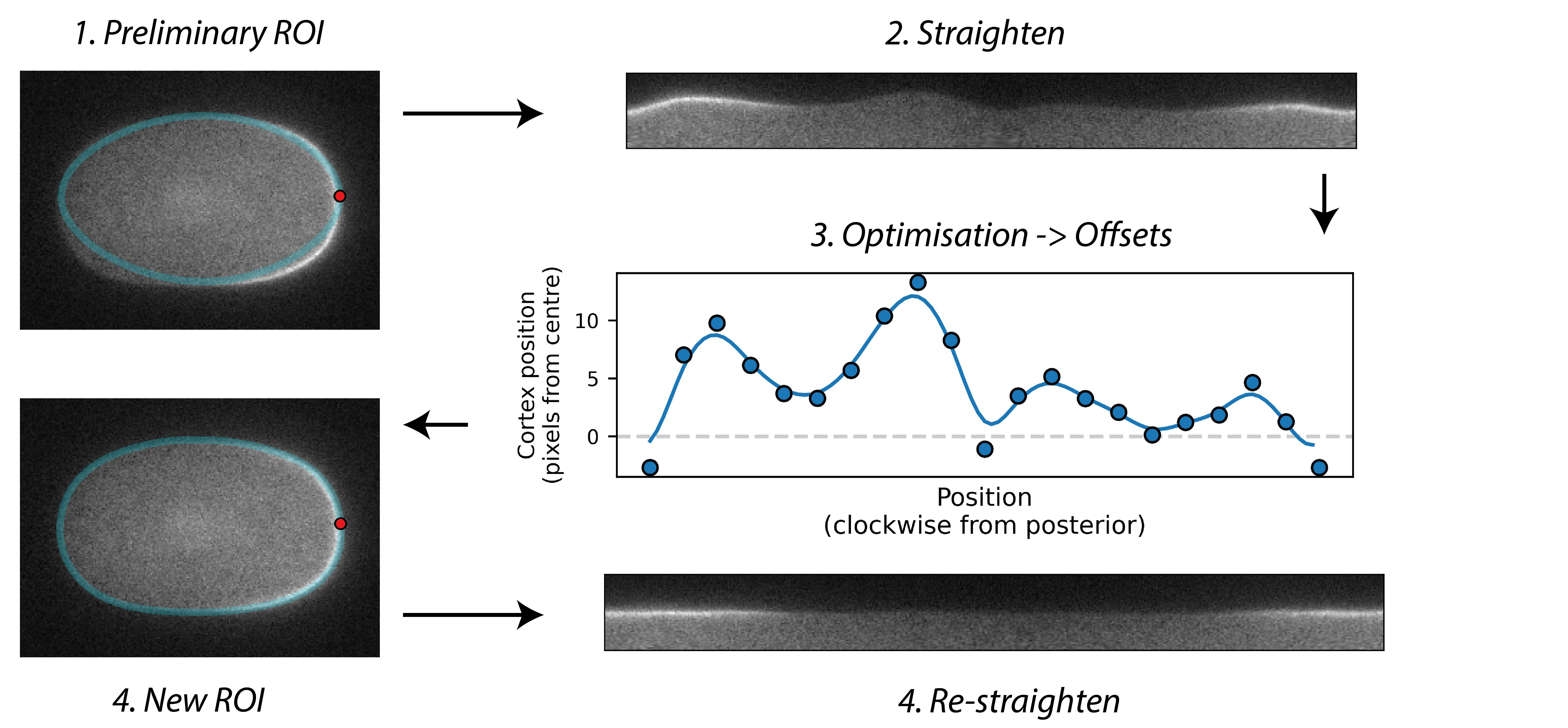 Starting with an initial rough manual ROI of the cell edge, the cortex of the image is straightened (Step 1). The program then attempts to mimic this straightened image by differentiable simulation (Step 2). In doing so, it learns the position of the cortex, which enables the ROI to be adjusted (Step 3) and the cortex re-straightened.