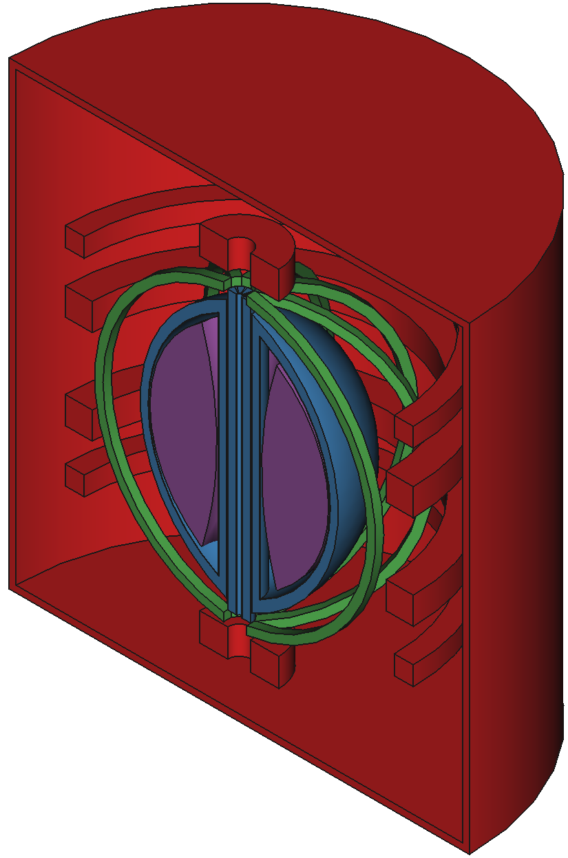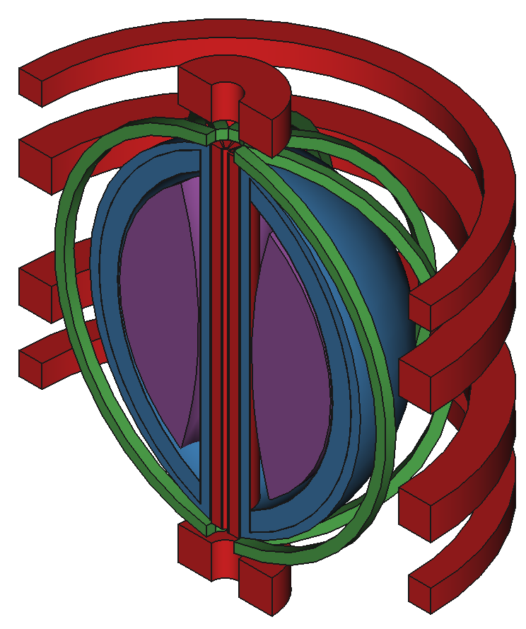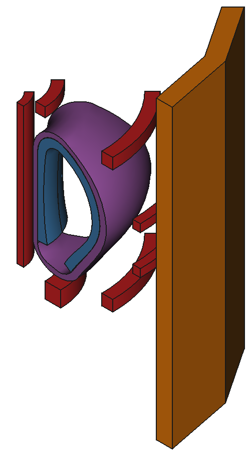 The different families of shapes that can be made with the Paramak are shown in the table below. The CadQuery objects created can be combined and modified (e.g. fillet corners) using CadQueries powerful filtering capabilties to create more complex models (e.g. a Tokamak). The Tokamak images below are coloured based on the shape family that the component is made from. There are also parametric shapes which provide convenient fusion relevent shapes for common reactor components.
