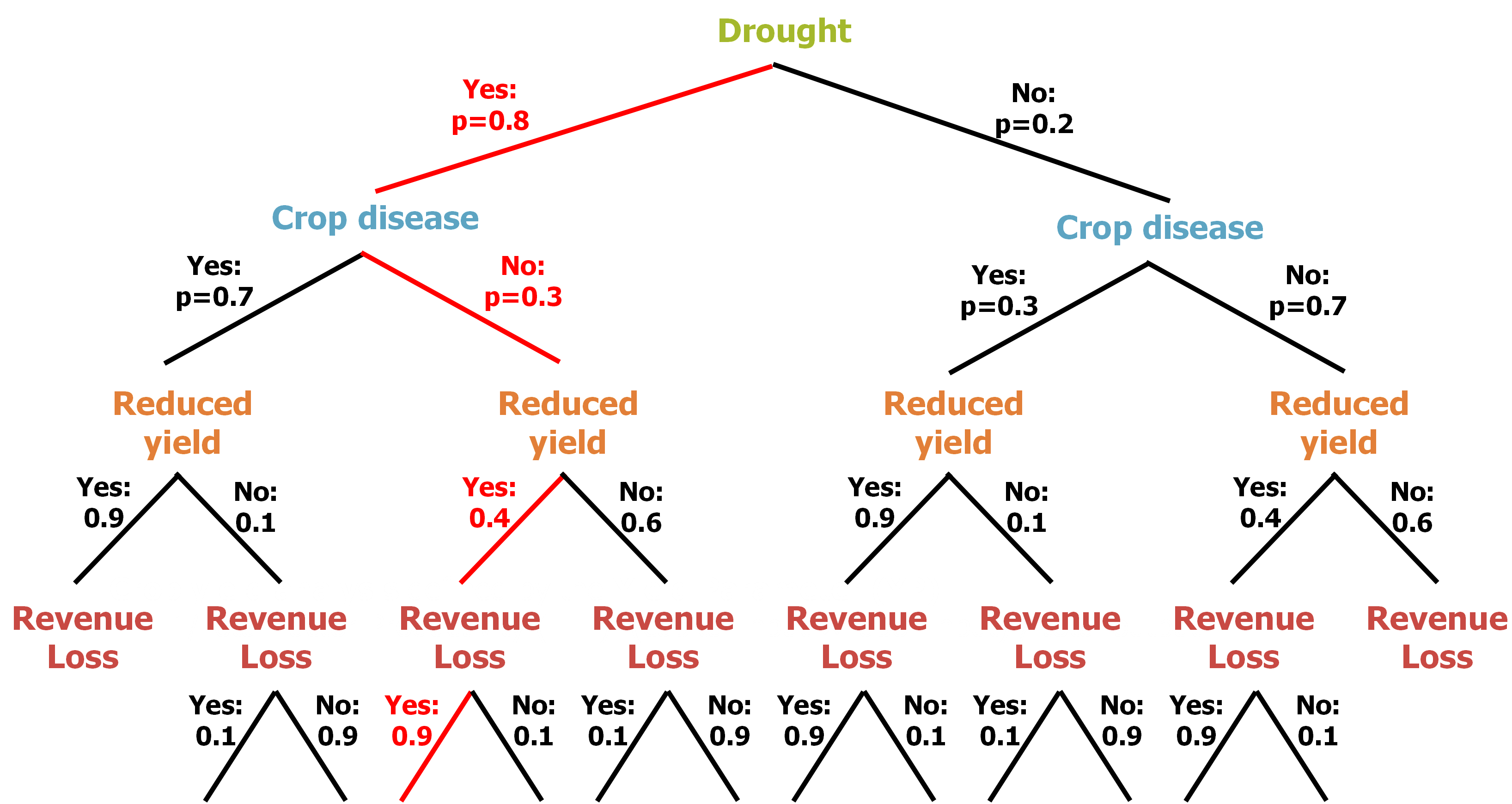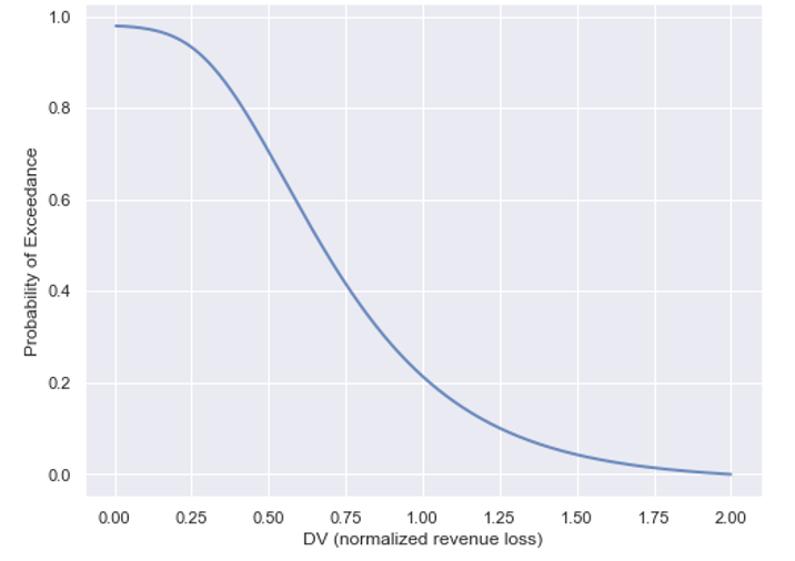 A branch graph (Figure 3) can be used to visualize the computations and to clarify the formulation and the numerical process. Since currently there is not sufficient data to quantify the probabilities, the developed script used some hypothetical values for each phase, resulting in the loss curve shown in Figure 4 as a demonstrative application.