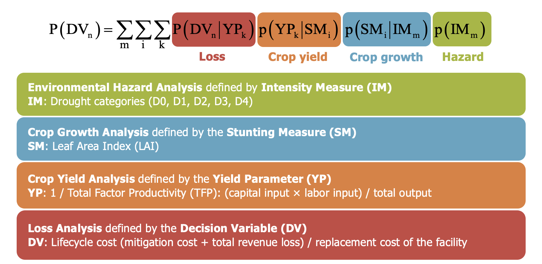 PBFE consists of four phases (environmental hazard analysis, crop growth analysis, crop yield analysis and loss analysis) and uses the total probability theorem to compute the loss curve which represents the Probability of Exceedance (POE) of different values of a Decision Variable (DV). We developed the Python script for implementing the PBFE methodology, where the selections of the variables in each phase are shown in Figure 2.