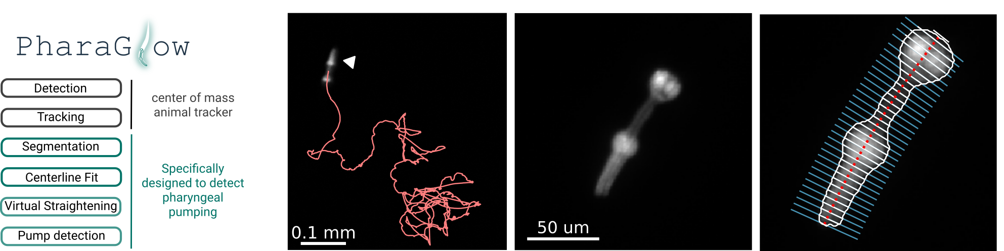 PharaGlow is a python package for tracking and analyzing C. elegans motion and feeding behavior from videos. The package can be used to simply track labelled pharynxes (or whole animals from brightfield) as a simple center of mass tracker, but it also has a pipeline to extract pharyngeal pumping and features of the pharynx.