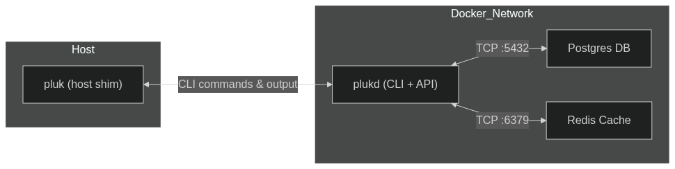 Pluk’s host shim (pluk) writes a Compose file and delegates commands into the container CLI (plukd). Inside the container, plukd interacts with Postgres and Redis; results stream back to your terminal.