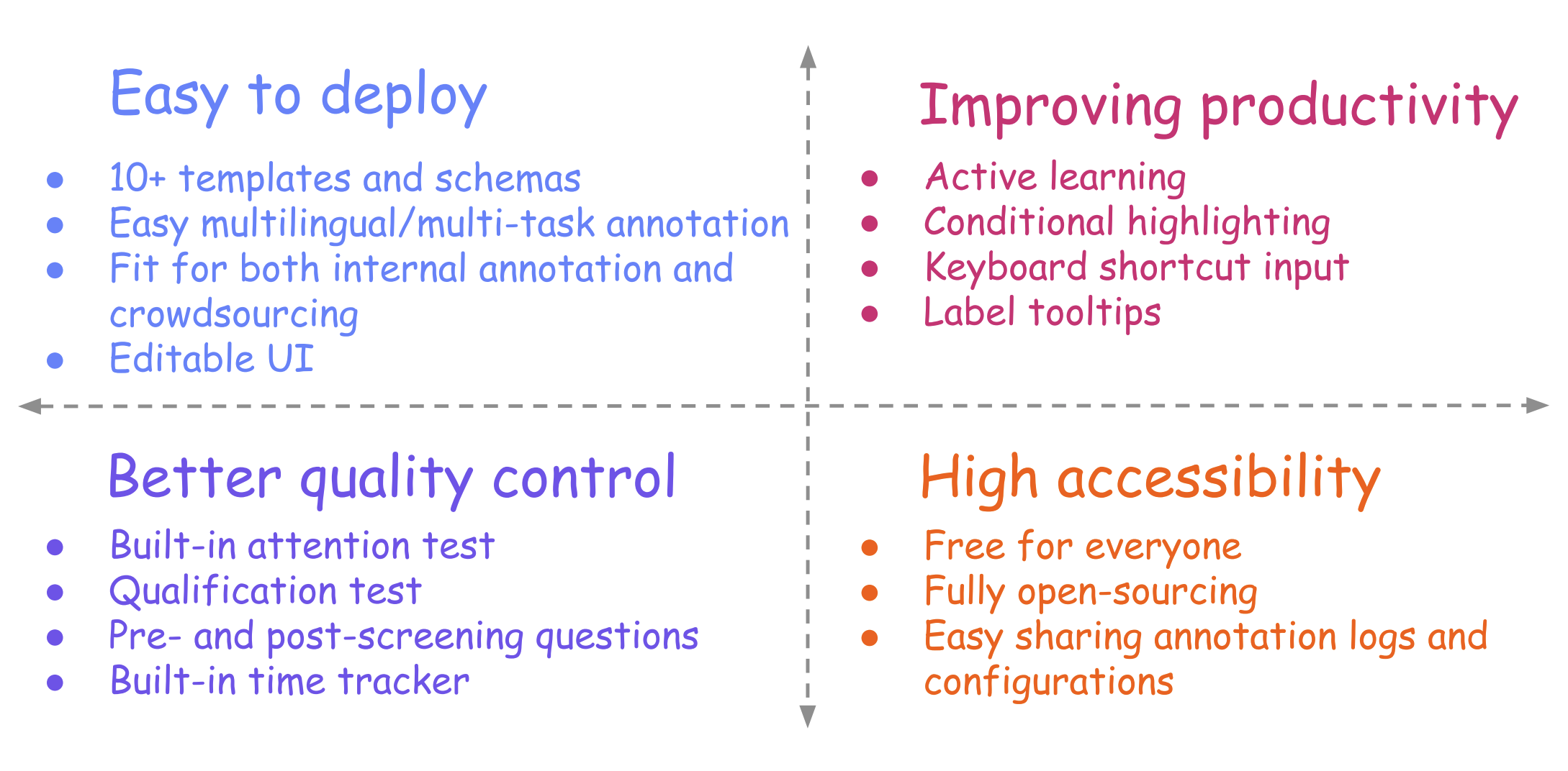 Potato can be easily set up with simply editing a configuration file. You don't need to write any codes to set up your annotation webpage. Potato also comes with a series of features for diverse needs.