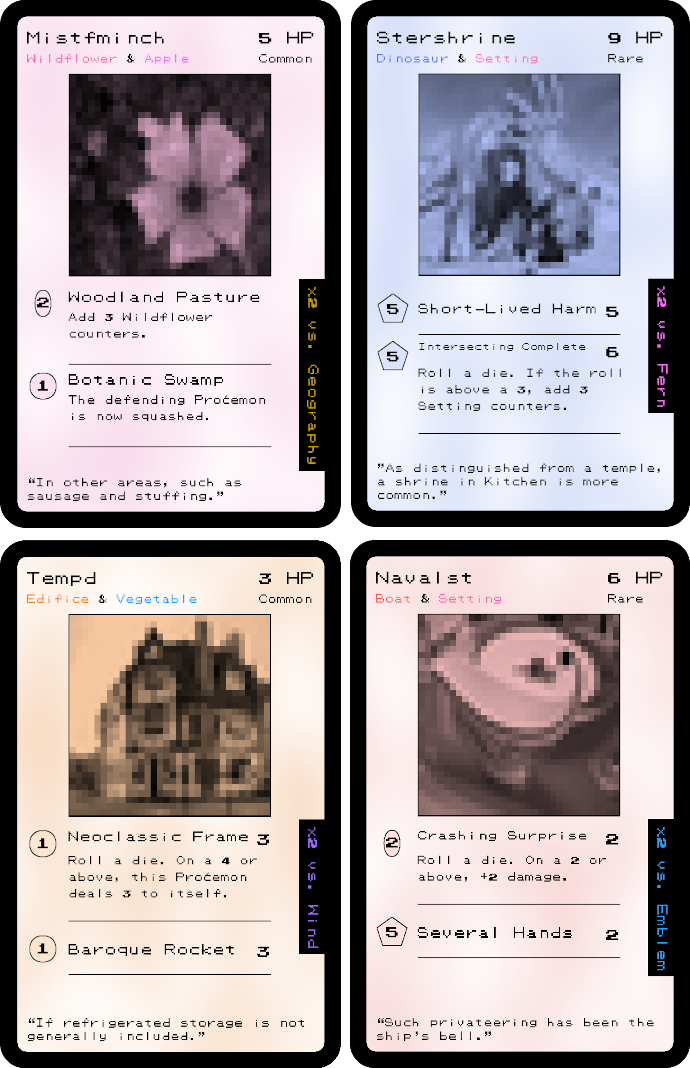 Proćemon is a procedurally-generated trading card game from the exceedingly popular Proćemon media franchise. I found the source code under a truck so I leaked it online. You can use it to create your own unique decks.