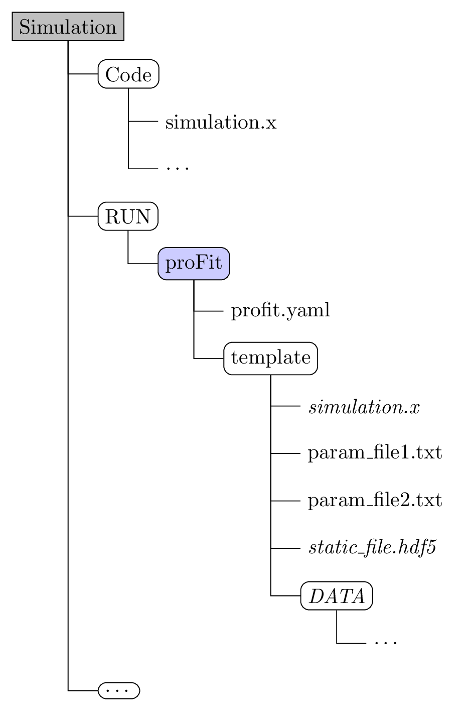 input.txtand the output data is collected inoutput.txt.For each run of the simulation, proFit creates a run directory, fills the templates with the generated input data and collects the results. Each step can be customized with the configuration file.