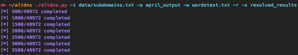 Alternatively, the -r flag can be passed to altdns so that once this output is generated, the tool can then resolve these subdomains (multi-threaded) and save the results to a file.