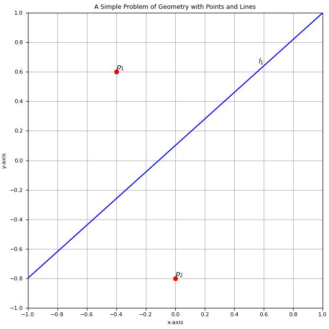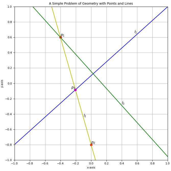 Additionally, in version 0.2.6, this package can be used by high school and undergraduate students to solve two-dimensional Cartesian geometry problems with points and lines, such as:
