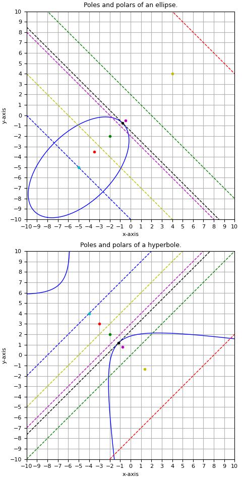- from a point named pole with respect to a given conic, find out its polar line and vice versa.