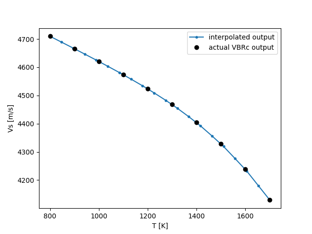 Note that the array to interpolate is specified as a tuple of output fieldnames: ("anelastic", "andrade_psp", "V") corresponds to accessing VBR.output.anelastic.andrade_psp.V. To interpolate at more than one point, you can provide an array of points: