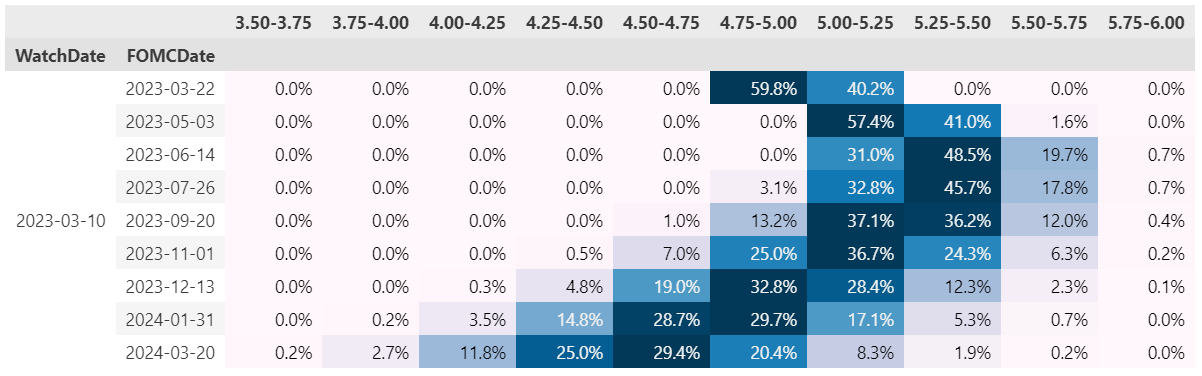 Calculated probabilities of target rates for the upcoming 9 FOMC meetings with a watch date of March 10, 2023: