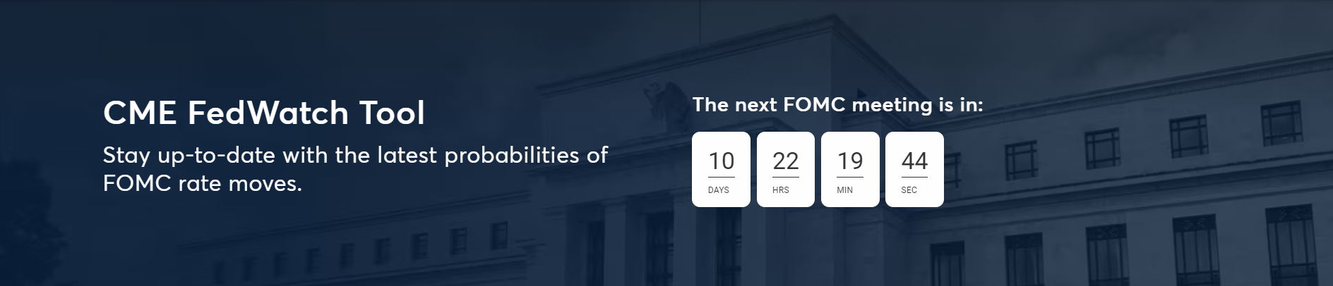 CME FedWatch tool is provided by the Chicago Mercantile Exchange (CME) and is used to estimate the probabilities of Federal Open Market Committee (FOMC) rate moves. The FOMC meetings are where decisions about interest rates are made, and the CME FedWatch Tool helps market participants assess the likelihood of rate changes based on fed funds futures prices. If you are not familar with the tool, take a look at the tool's demo video and also the CME FedWatch Webpage to find out what is the likelihood that the Fed will change the Federal target rate at upcoming FOMC meetings, according to interest rate traders, in real time. You can also find the tools's methodology, which is briefly described here.