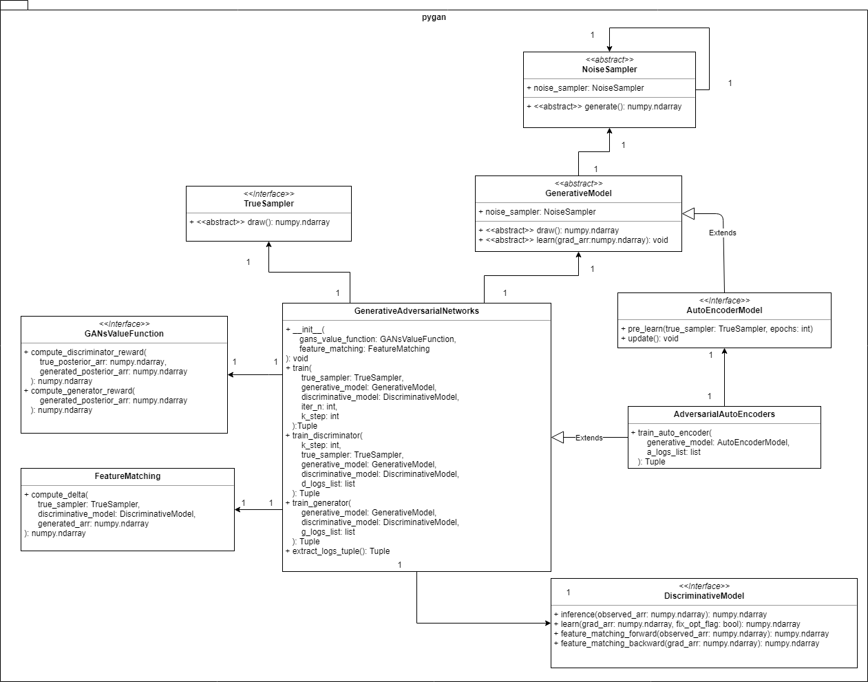 The structural extension from GANs to AAEs is achieved by the inheritance of two classes: GenerativeModel and GenerativeAdversarialNetworks. One of the main concepts of AAEs, which is worthy of special mention, can be considered that the Auto-Encoders can be transformed into the generative Models. Therefore this library firstly implements a AutoEncoderModel by inheriting GenerativeModel. Next, this library watches closely that the difference between GANs and AAEs brings us different context in the Strategy Pattern in relation to the learning algorithm of Auto-Encoders. By the addition of the AutoEncoderModel's learning method, this library provieds AdversarialAutoEncoders which is-a GenerativeAdversarialNetworks and makes it possible to train not only GenerativeModel and DiscriminativeModel but also AutoEncoderModel.