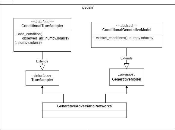 Like Yang, L. C., et al. (2017), this library implements the Conditioner to conditon on external information. As class configuration in this library, the Conditioner is divided into two, ConditionalGenerativeModel and ConditionalTrueSampler. This library consider that the ConditionalGenerativeModel and ConditionalTrueSampler contain Conditioner of the Conditional GANs to reduce the burden of architectural design. The controller GenerativeAdversarialNetworks functionally uses the conditions in a black boxed state.