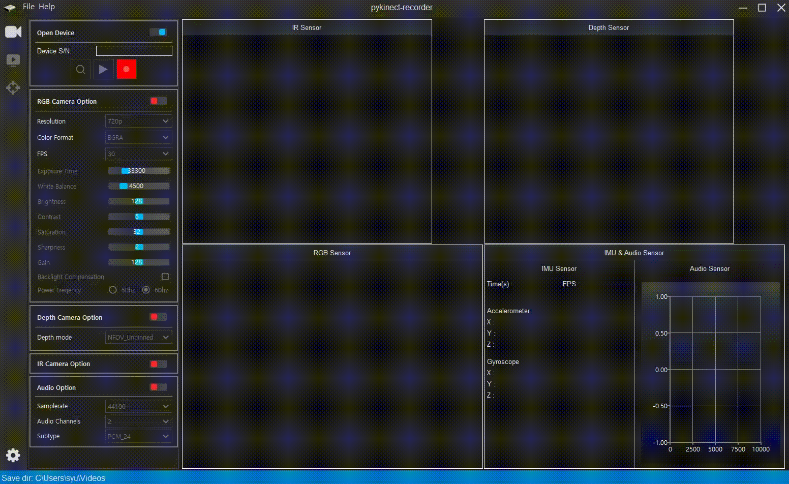- See RGB, IR, Depth, IMU and Audio data when recoding.