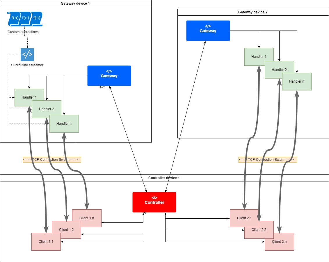 There are 4 main components involved namely: Gateway, Controller, Handler & a Client. Gateway acts as a small server which listens