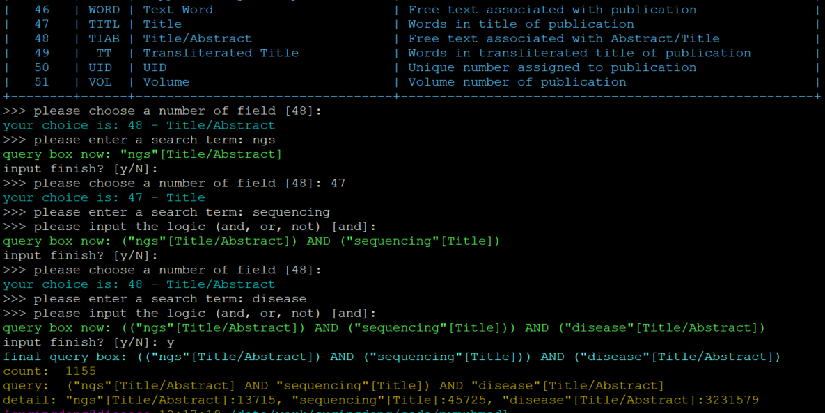 pypubmed search 'NGS[Title] AND Disease[Title/Abstract]' -o ngs_disease.xlsx