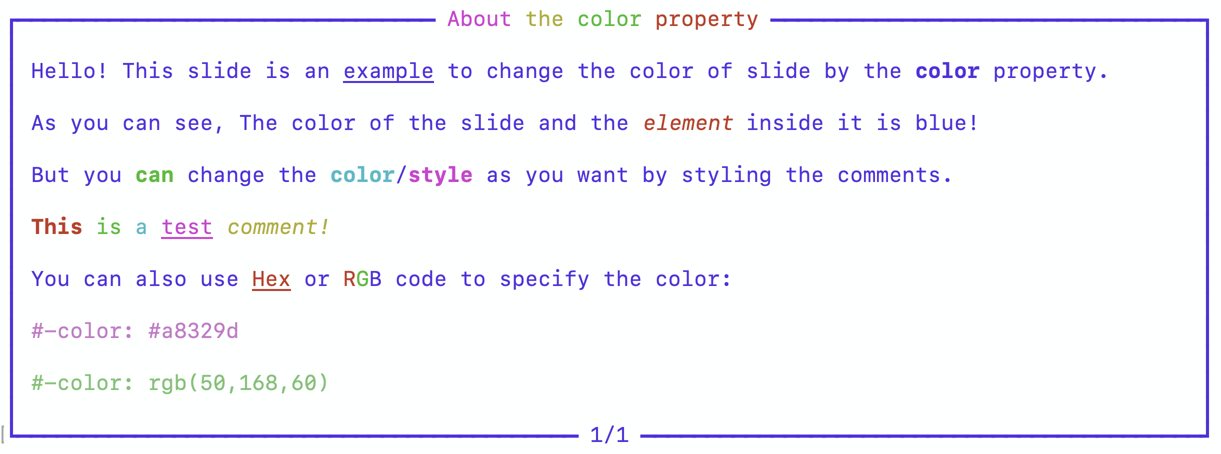 This property refers to the color of the slide and its components (The default value is equal to default or color of the terminal font):