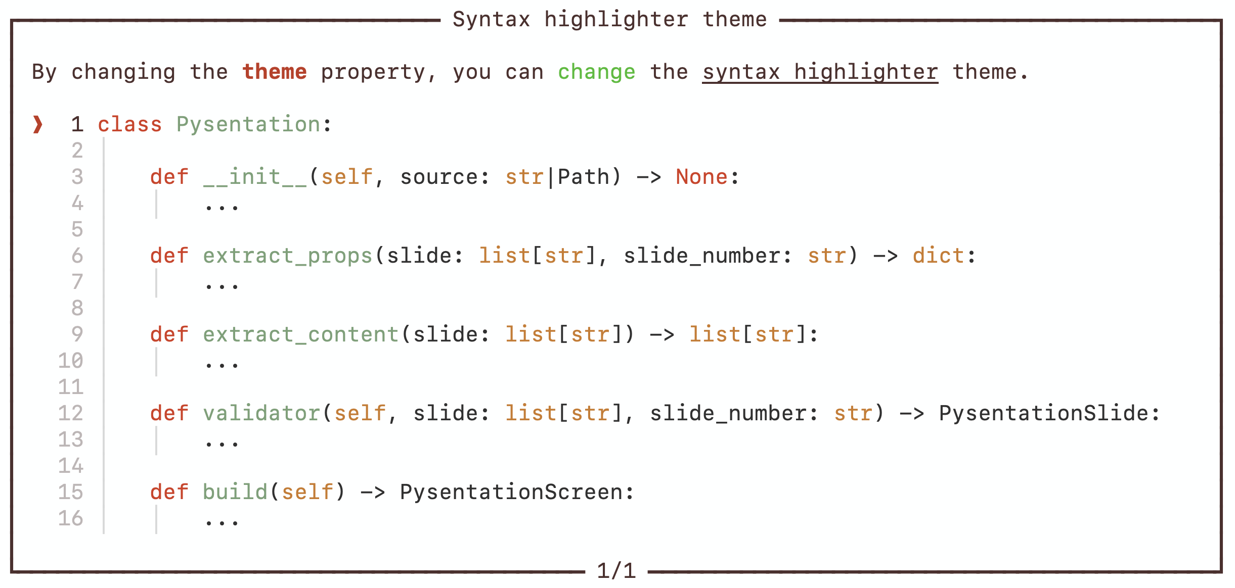 | Theme | You can change the theme of syntax highlighters of the slide with this property. | #-theme: github-dark | gruvbox-dark |