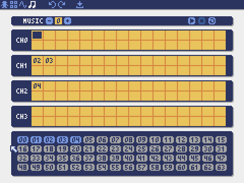 Example:pyxel.musics[0].set([0, 1], [], [3]) -