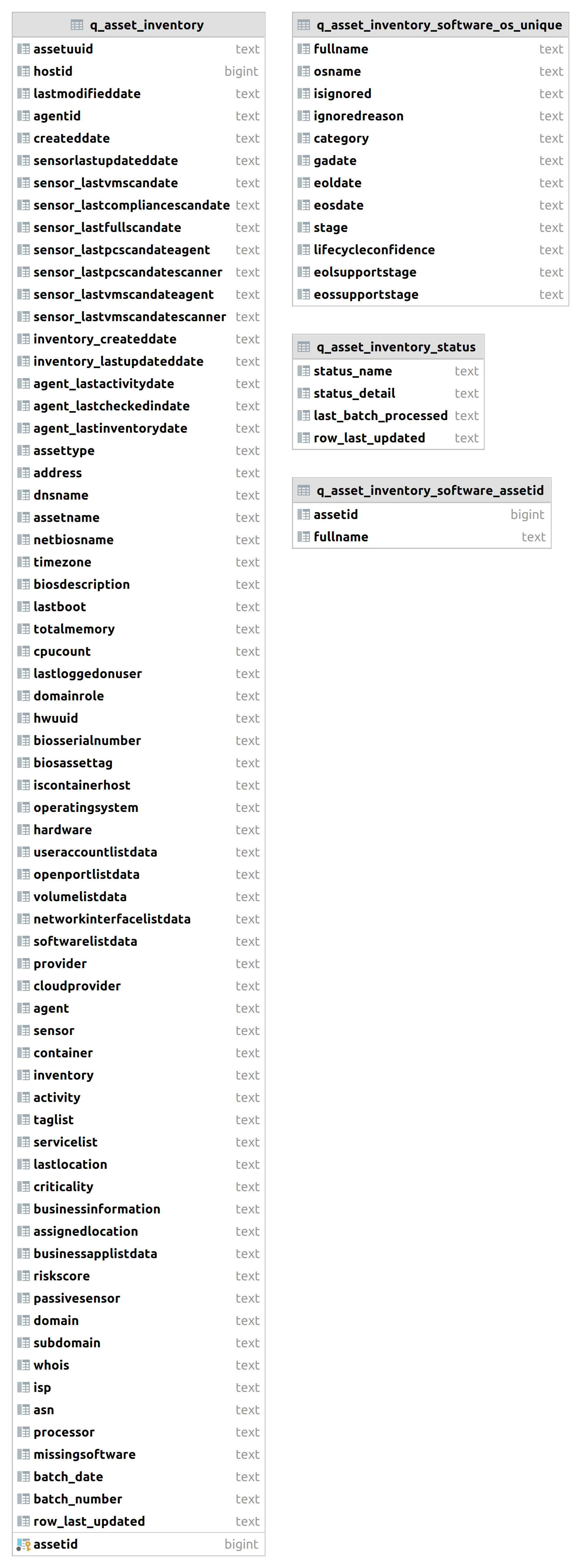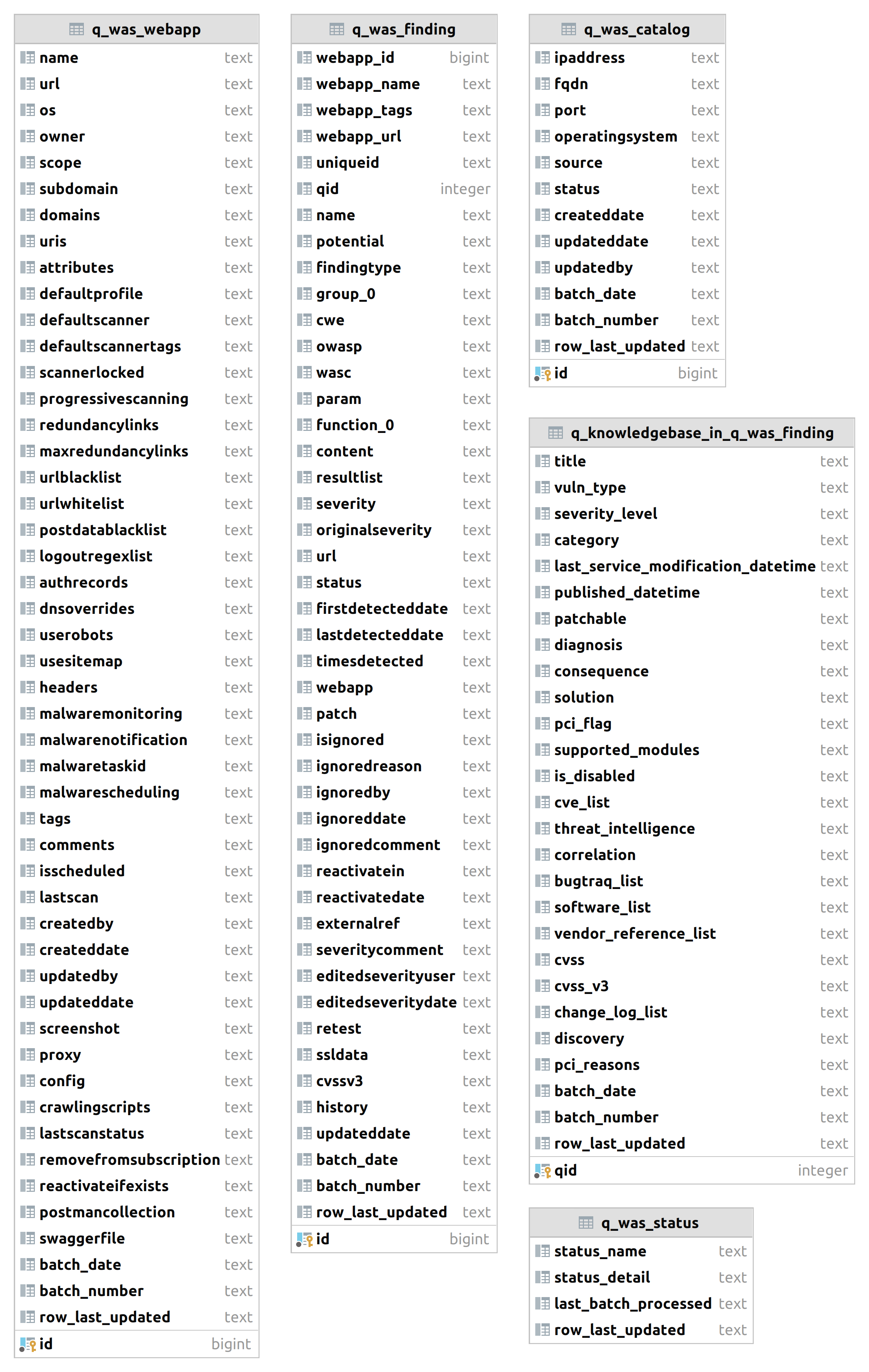 - The latest schema snapshots are in this document for reference. To obtain the latest schema from QualysETL, please use the SQLite Database output from QualysETL.