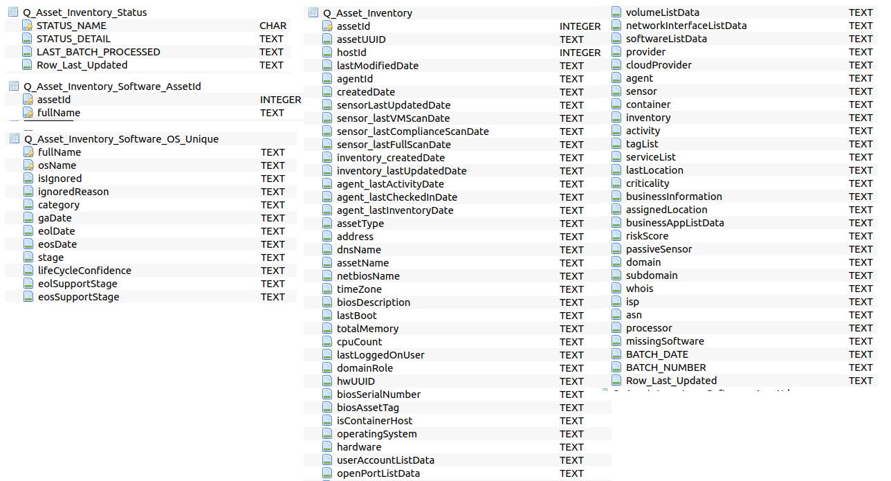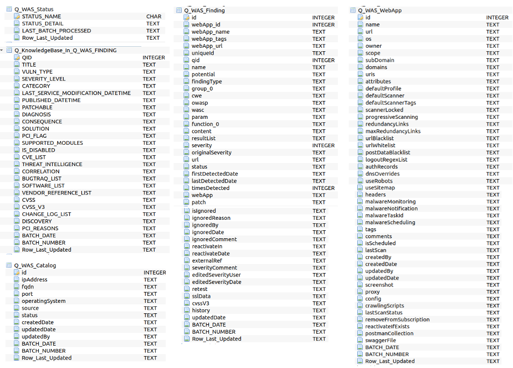 - The latest schema snapshots are in this document. Get a copy of the schema from QualysETL Sqlite Databases.