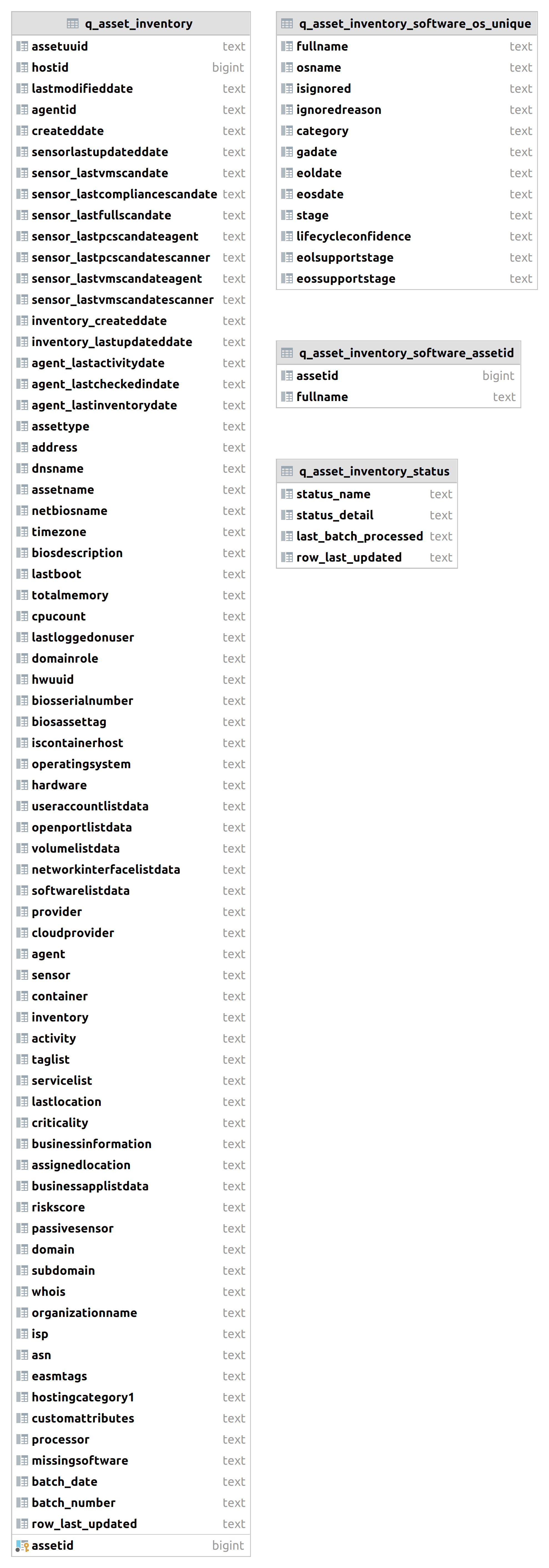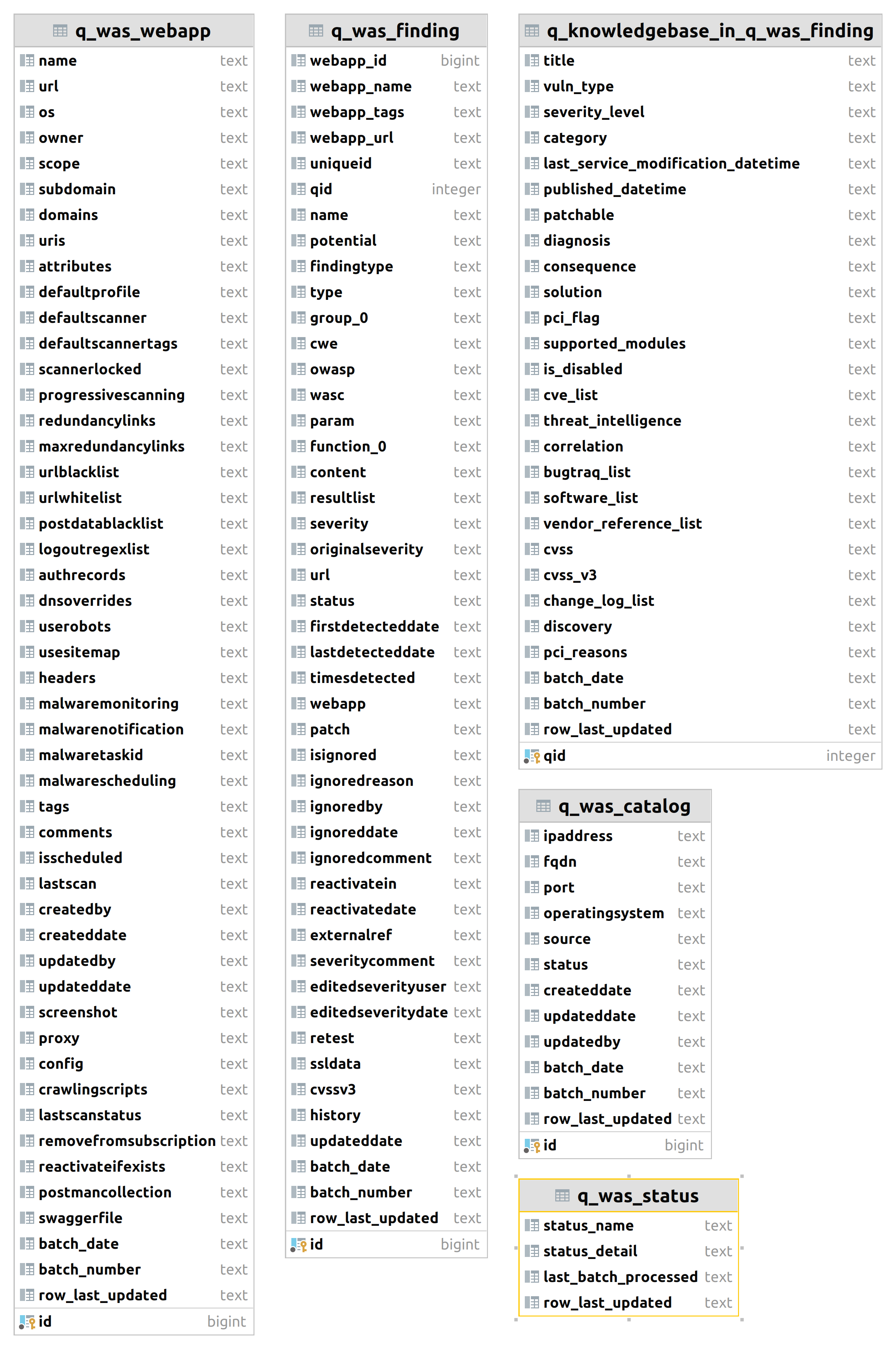 - The latest schema snapshots are in this document for reference. To obtain the latest schema from QualysETL, please use the SQLite Database output from QualysETL.