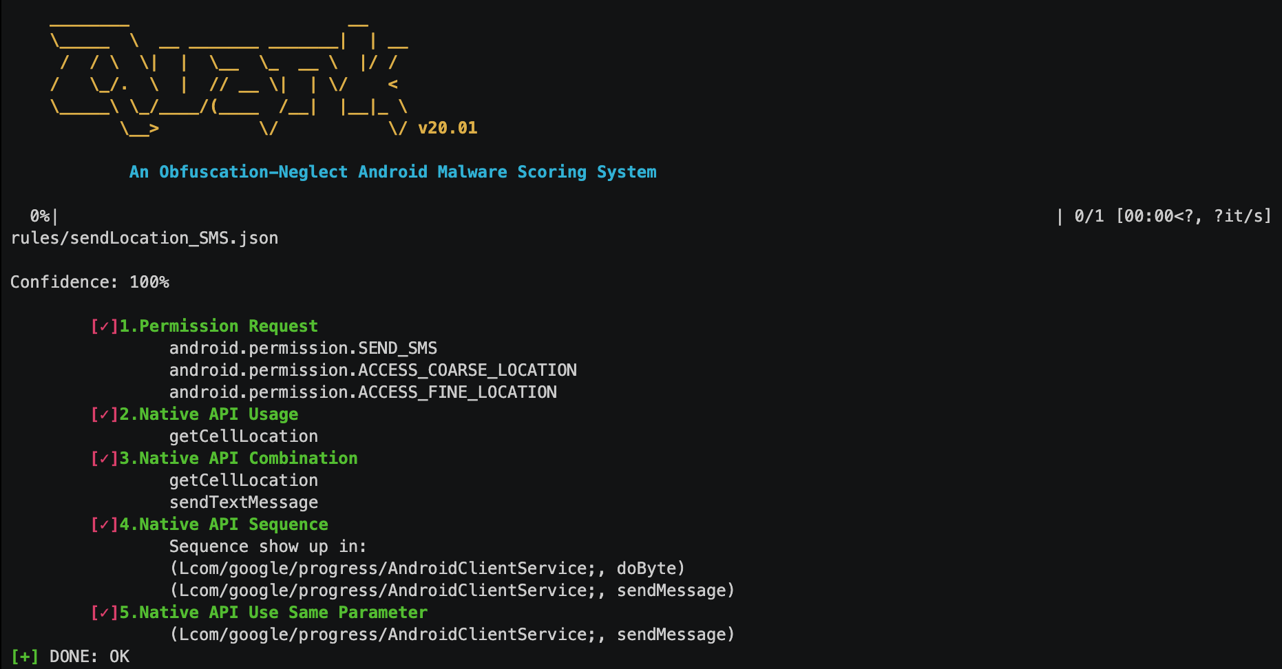 Our Dalvik bytecode loader consists of functionalities such as 1. Finding cross reference and calling sequence of the native API. 2. Tracing the bytecode register. The combination of these functionalities (yes, the order theory) not only can neglect obfuscation but also match perfectly to the design of our malware scoring system.