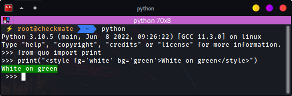 print('<style fg="white" bg="green">White on green</stlye>')