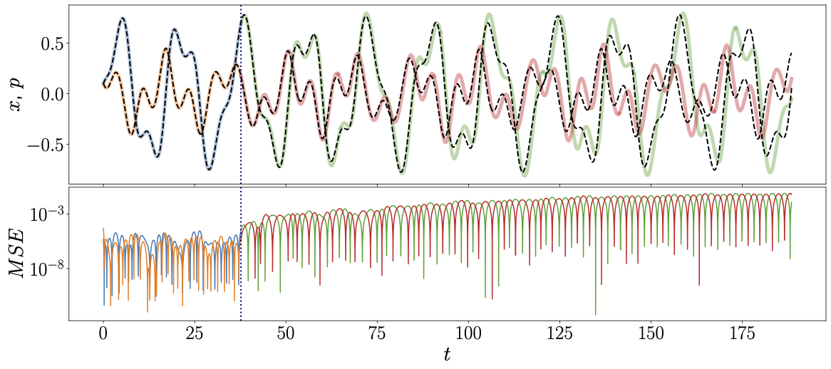 Top plot: Above the ground truth data of the forced pendulum is plotted as dashed lines. The position training set is plotted in yellow and the position prediction is plotted in red. The momentum training set prediction is plotted in blue and the test set prediction is plotted in red.
