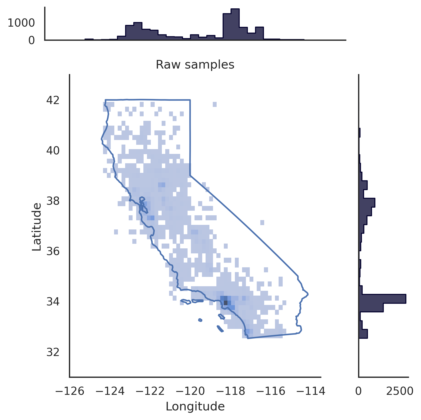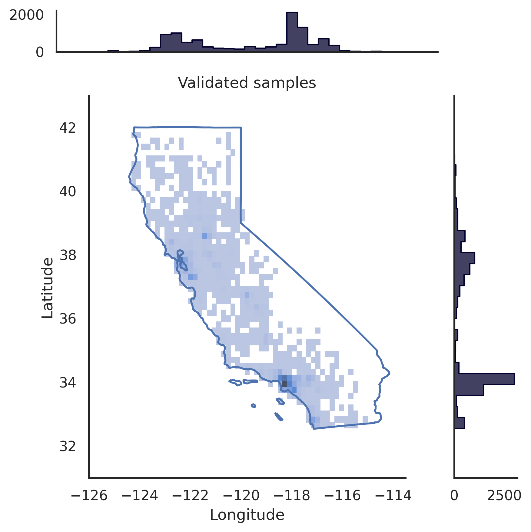 The REaLTabFormer framework provides an interface to easily build observation validators for filtering invalid synthetic samples. We show an example of using the GeoValidator below. The chart on the left shows the distribution of the generated latitude and longitude without validation. The chart on the right shows the synthetic samples with observations that have been validated using the GeoValidator with the California boundary. Still, even when we did not optimally train the model for generating this, the invalid samples (falling outside of the boundary) are scarce from the generated data with no validator.