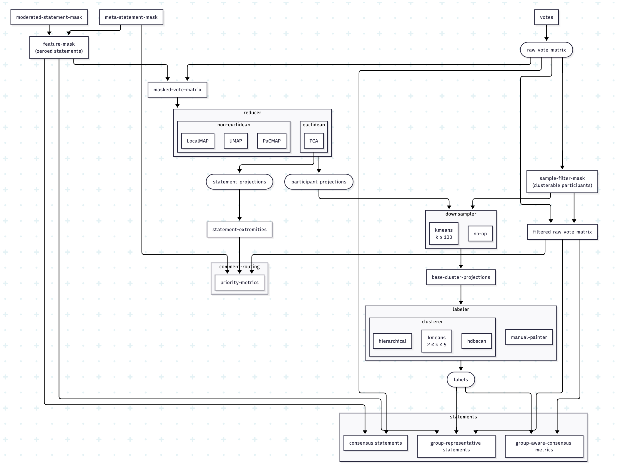 - Reproduces Polis calculation pipeline from only raw vote data.