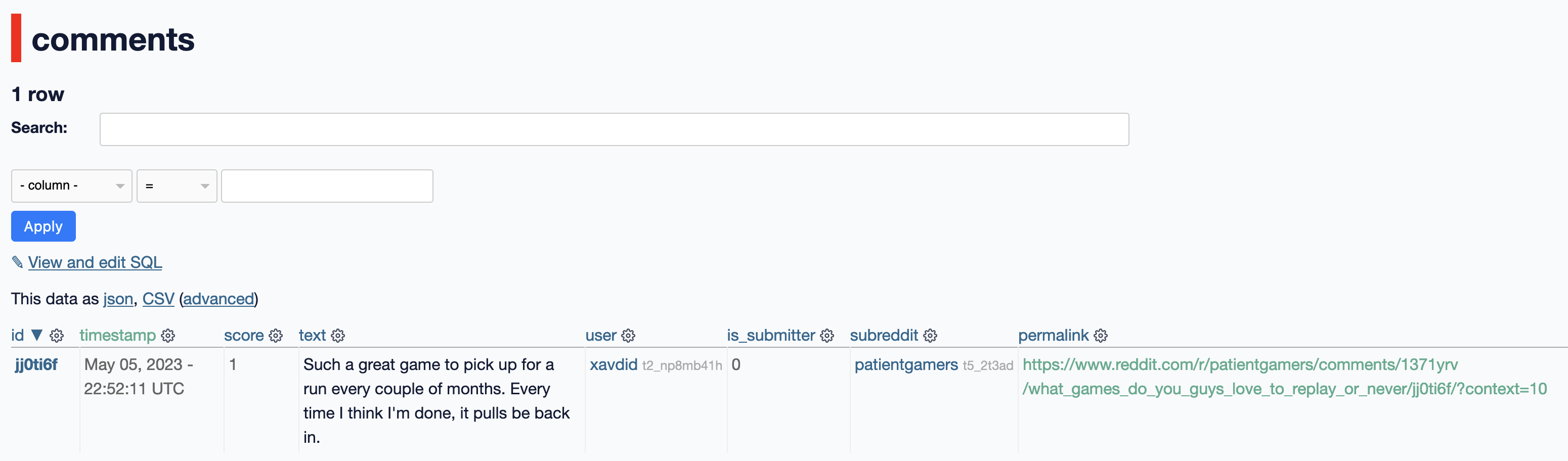 While most Dogsheep projects grab the raw JSON output of their source APIs, Reddit's API has a lot of junk in it. So, I opted for a slimmed down approach.