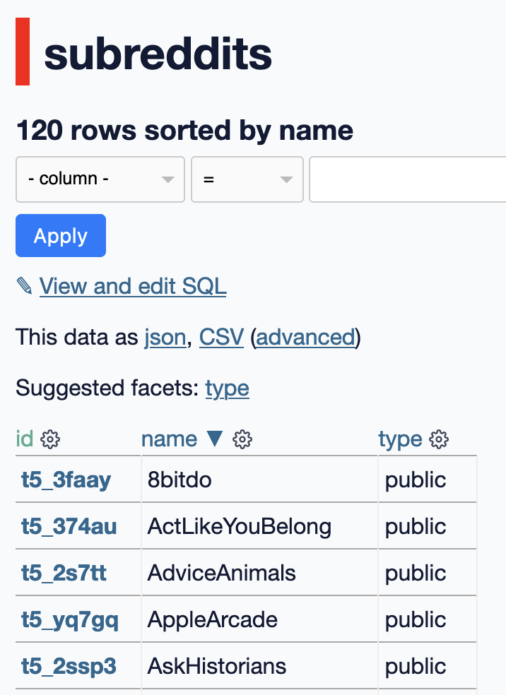 datasette reddit.db --metadata metadata.json