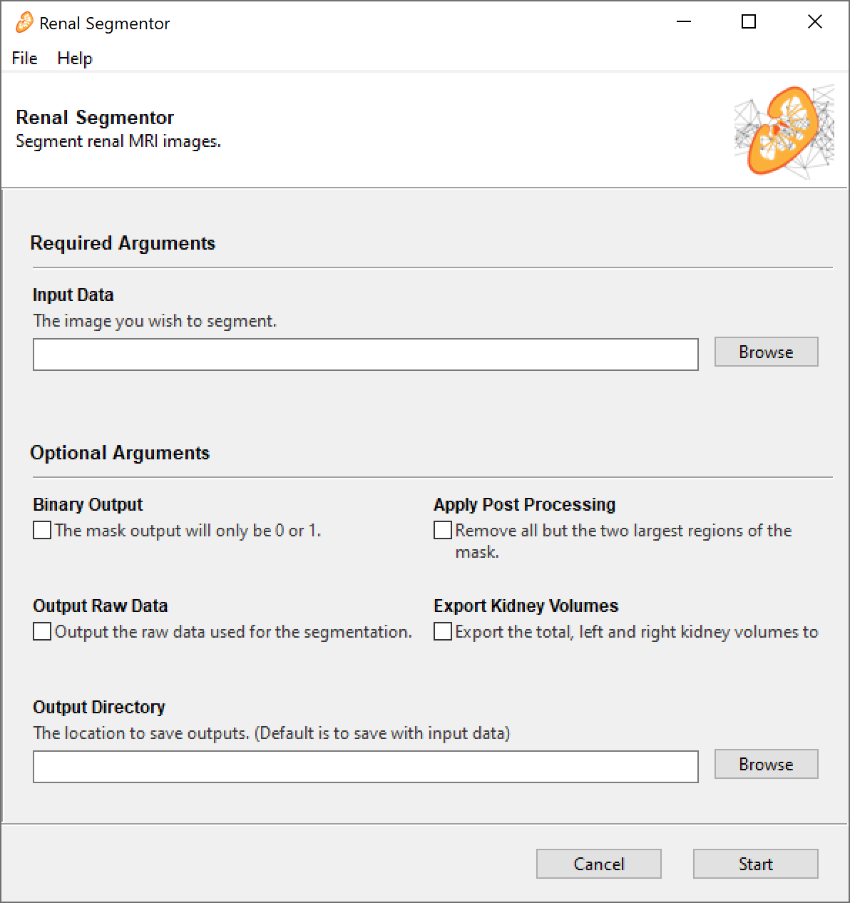 renal_segmentor.exe -hto generate a list of available parameters. The application runs via a command line if any input arguments are specified, if not, it opens as a GUI.