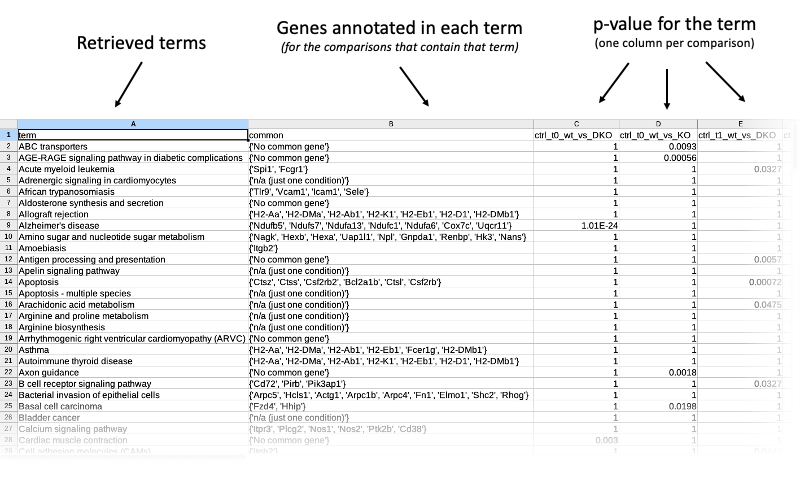 The table contains all terms cumulatively retrieved from all comparisons (each one of the inpt files containing the genes of interest between any two experimental conditions). For every term, common genes (if any) are listed. These common genes only include comparisons where the term actually shows up. If the term just appears in exactly one comparison, this is explicitly stated: n/a (just one condition). P-values are the ones retrieved from the STRING tables (the lower, the better). Missing p-values are represented with 1 (that is, in that specific comparison the term is 100% likely not enriched).