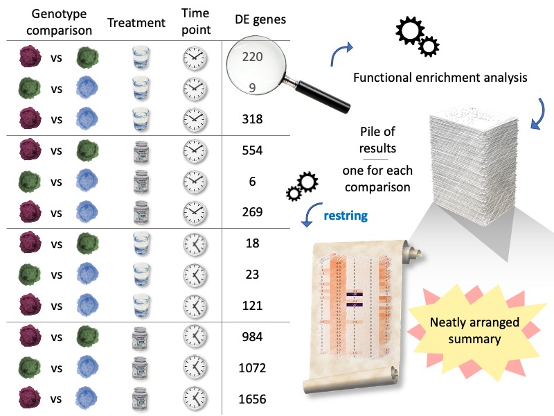 Modern high-throughput -omic approaches generate huge lists of differentially expressed (DE) genes/proteins, which can in turn be used for functional enrichment studies. Manualy reviewing a large number of such analyses is time consuming, especially for experimental designs with more than a few groups. Let's consider this experimental setup: