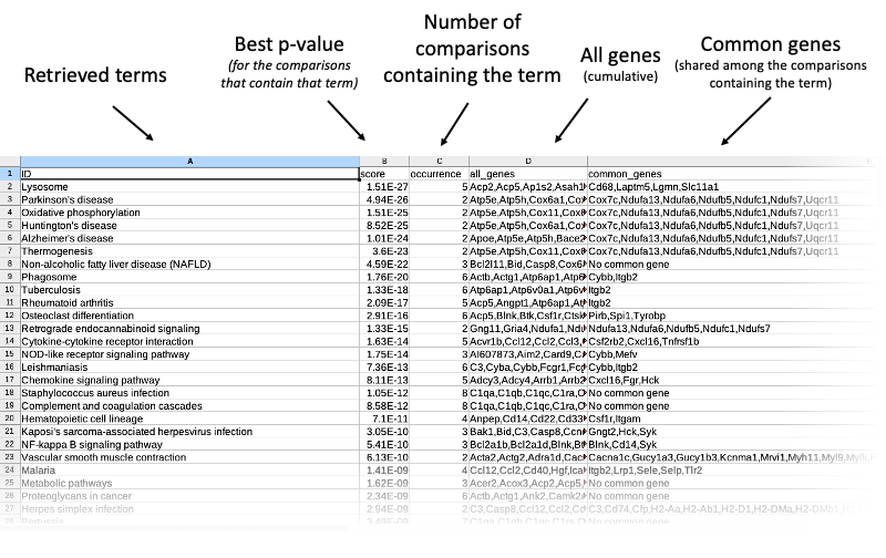 These can be useful to find the most interesting terms across all comparisons: better p-value, presence in most/selected comparisons), as well as finding the most recurring DE genes for each term.