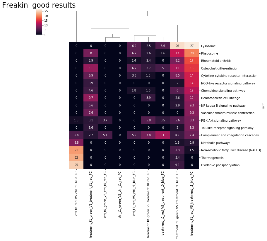 "results.csv", pval_min=8, title="Freakin' good results", unwanted_terms=bad,