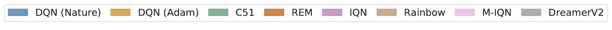 algorithms = ['DQN (Nature)', 'DQN (Adam)', 'C51', 'REM', 'Rainbow',