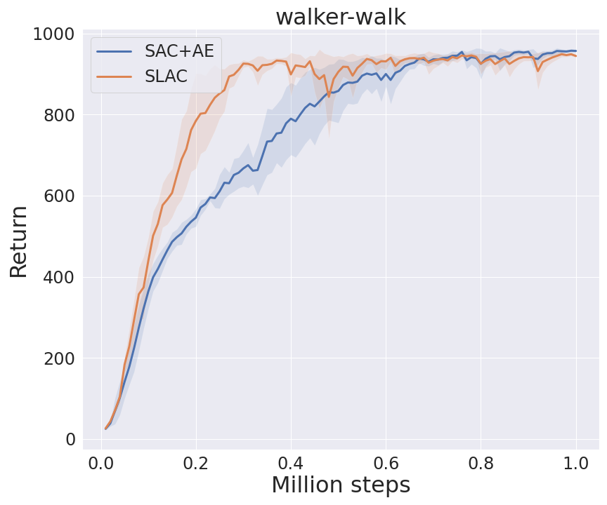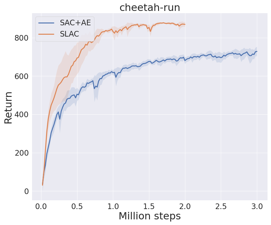 I benchmarked SAC+AE and SLAC implementations in some environments from DeepMind Control Suite (code). Note that the horizontal axis represents the environment step, which is obtained by multiplying agent_step by action_repeat. I set action_repeat to 4 for cheetah-run and 2 for walker-walk.