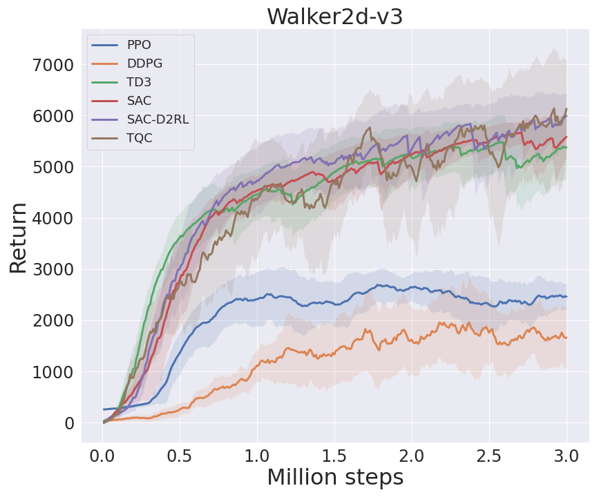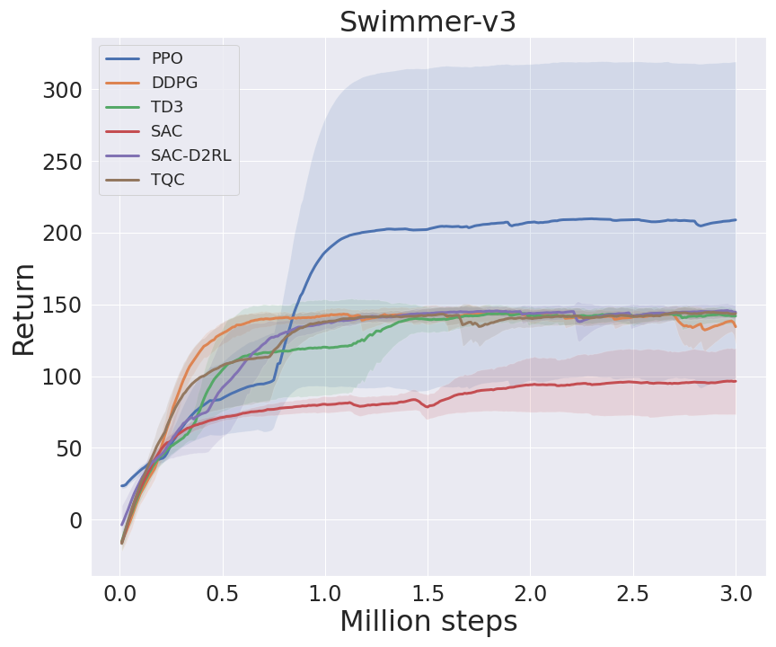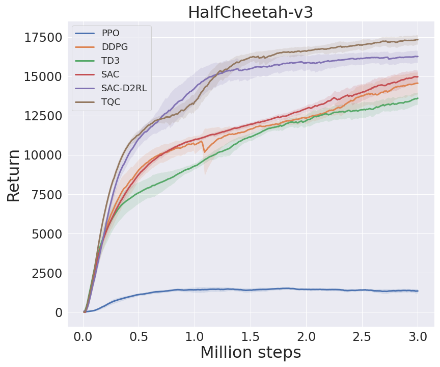 I benchmarked my implementations in some environments from MuJoCo's -v3 task suite, following Spinning Up's benchmarks (code). In TQC, I set num_quantiles_to_drop to 0 for HalfCheetath-v3 and 2 for other environments. Note that I benchmarked with 3M agent steps, not 5M agent steps as in TQC's paper.