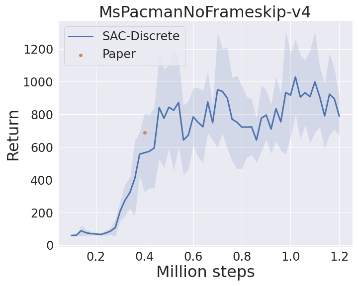 I benchmarked SAC-Discrete implementation in MsPacmanNoFrameskip-v4 from the Arcade Learning Environment(ALE) (code). Note that the horizontal axis represents the environment step, which is obtained by multiplying agent_step by 4.